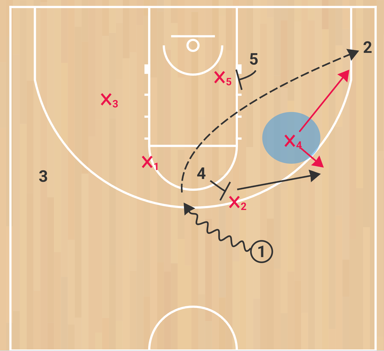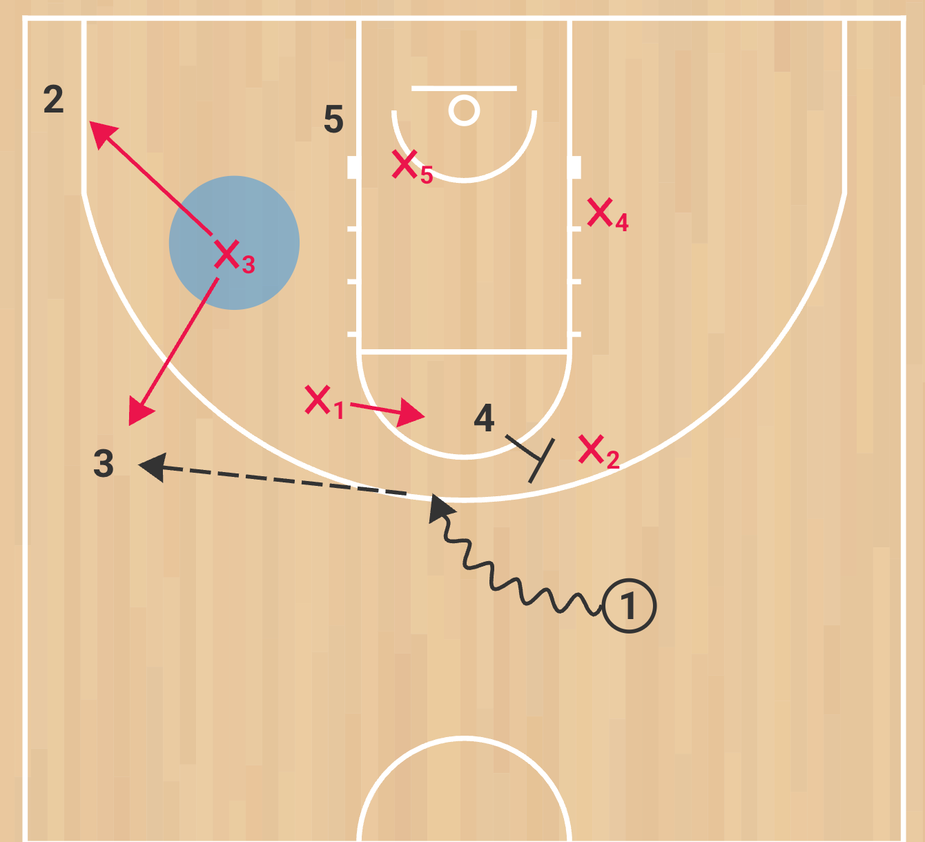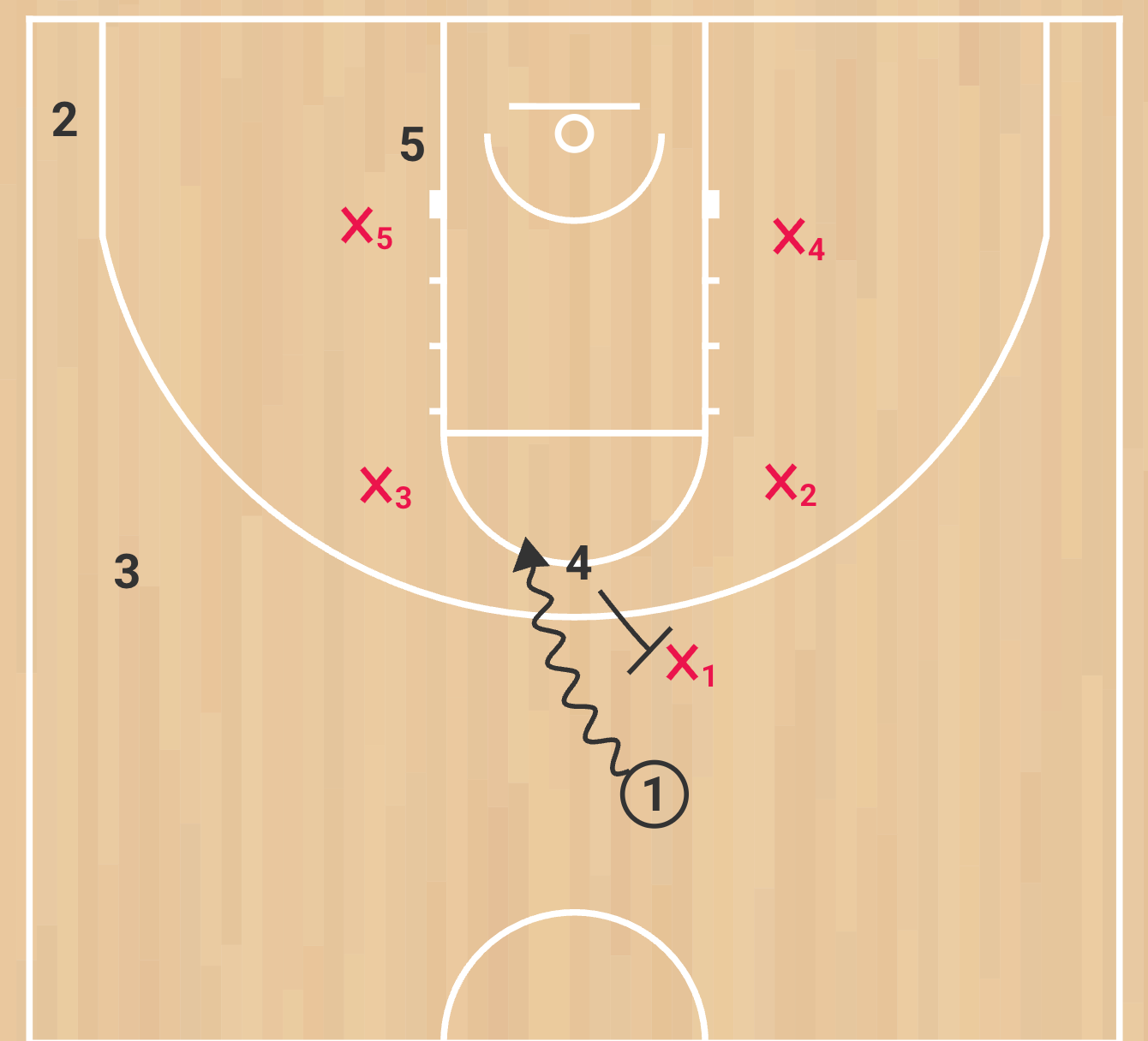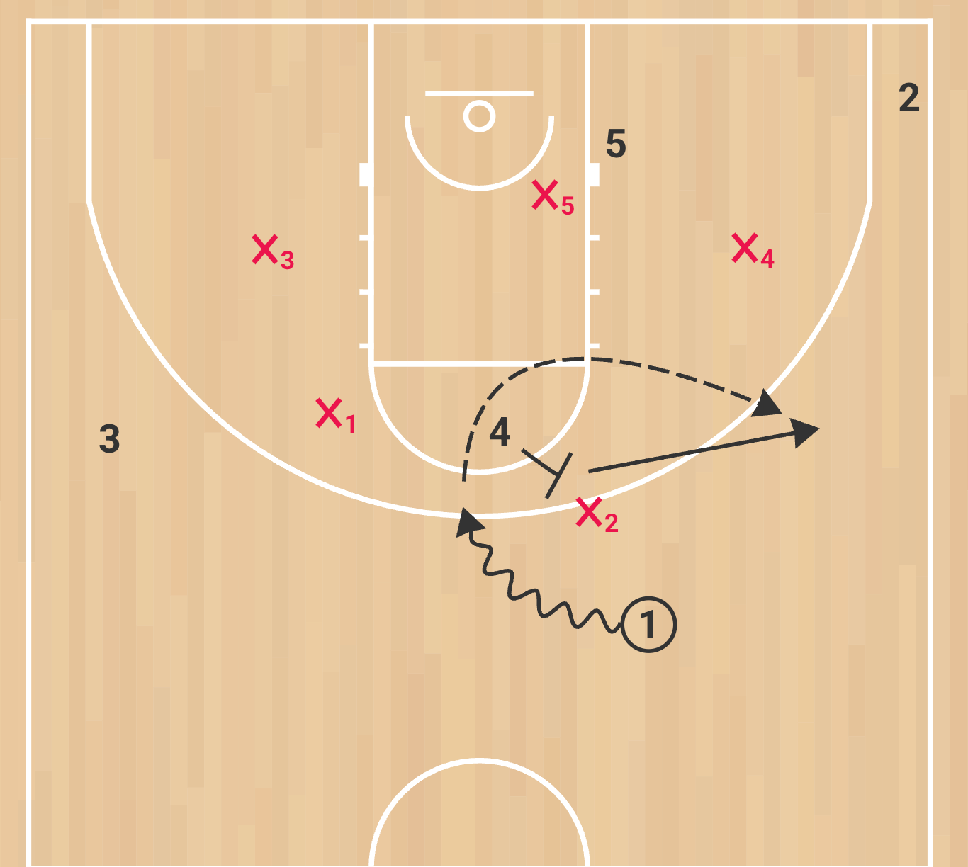 Same concepts and reads apply here. You’re reading what the x4 does and can attack, throw high post, shot or one more.